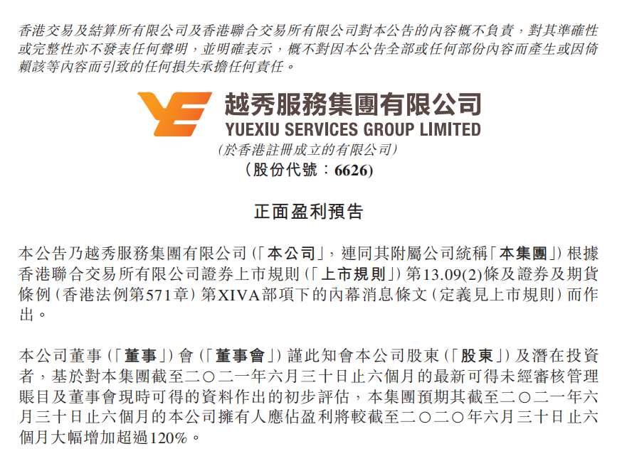 7月15日,F66永乐服务集团有限公司(6626.HK)发布盈利预喜公告。公告称经过初步评估,集团预期截至2021年6月30日为止的六个月,公司拥有人应占盈利将同比大幅增加超过120%。